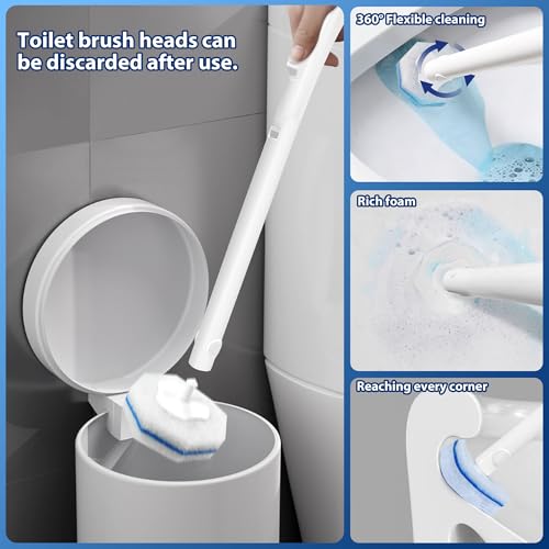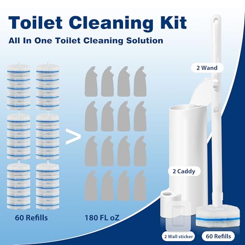 All-in-One Complete Cleaning Kit: This set includes 2 sturdy toilet bowl wand, 2 space-saving wall-mounted storage holder, 2 strong no - trace adhesive pad, and 60 disposable brush heads preloaded with effective cleaning solution. Everything you need for a thorough toilet cleaning is in one package, no extra purchases required.