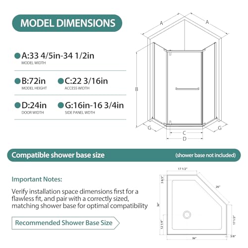 ?Efficient Space Utilization with Neo-Angle Design?Transform your bathroom space effectively with this neo-angle shower door, which boasts a compact 36" x 36" size while maximizing available area. It features a roomy 25" walk-in width and a 72" height, making it ideal for smaller bathrooms without compromising on comfortable access.