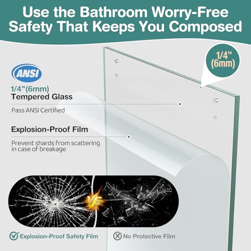 ?High-Quality Glass Construction for Shower Doors?Featuring 1/4" high-grade tempered glass with SGCC certification, our glass shower door meets strict safety and quality standards. It's crystal-clear, brightening the bathroom. As a key part of frameless pivot shower doors, this tempered glass is far more durable than regular glass, highly impact-resistant for long-term use.