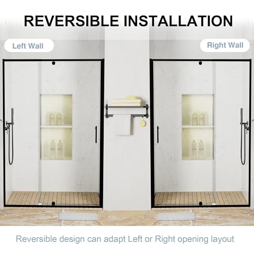 ?Superior Safety & Durability?: Crafted with 1/4" (6mm) SGCC certified tempered glass, this shower glass door is impact-resistant and safe. If broken, it breaks into dull-edged pieces, not sharp shards, reducing injury risk. The bathroom glass door features a reversible design for left or right pivot shower door installation, adapting to your bathroom layout. Corrosion-resistant aluminum and stainless steel ensure durability in humid conditions.