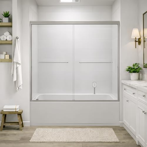?Fits Standard Bathrooms (56-60" Width)?This semi-frameless shower door adjusts from 56 to 60 inches wide (cut-to-fit) to perfectly fit your bathroom shower layout. Features a smooth double bypass sliding design requiring minimal clearance, ideal for walk-in showers or bathtub enclosures (Walk-in Size: 28-1/2" W x 54-1/2" H).