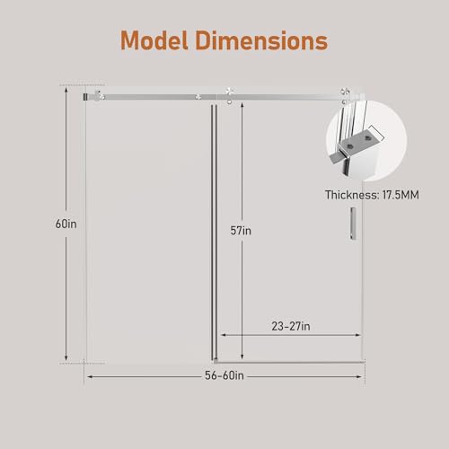 ?Adjustable Fit & Premium Brushed Nickle Finish?This sliding shower door fits a 56-60 inch width x 60 inch height opening, with a walk-in size of 27 inches width x 57 inches height. The adjustable top track rail allows up to 4 inches(Adjustment by cutting the top track rail) of width customization for a perfect fit. Features a Brushed Nickle finish for a modern bathroom aesthetic, compatible with both contemporary and traditional décor. Reversible fixed/sliding panels allow flexible installation to match any bathroom layout