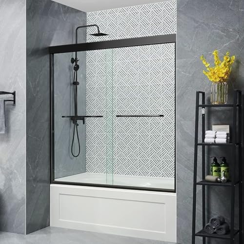 Adjustable Fit-This adjustable bathtub glass shower door door (56''-60" W x 57" H) fits most spaces. Simply trim the top/bottom rails (up to 4 inches) for a perfect custom fit. The double sliding shower doors for bath tub design allows easy entry from either side.