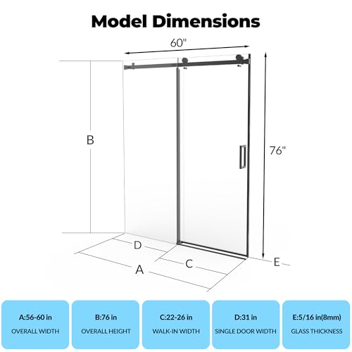 Versatile Sizing: Designed to fit openings from 56 to 60 inches wide and 76 inches high, this 60-inch shower door is versatile for use as a tub or walk-in shower door, providing a perfect fit and a seamless look