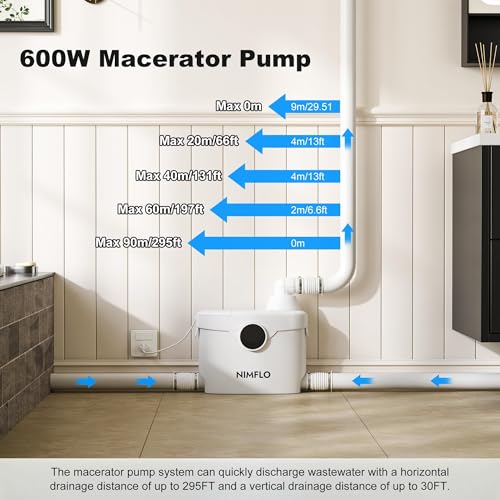 600W High-Speed Macerator – 2800 RPM Motor Grinds and pumps waste vertically up to 29.5 ft and horizontally up to 295 ft with stainless steel blades.