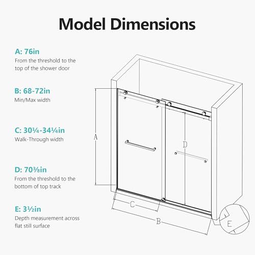 ???? DOUBLE BYPASS SLIIDNG: This semi-frameless shower door can be adjusted to 68 and 72 in width by cutting, maximize your bathroom layout of our double sliding door system, designed for easy access while using minimal space for smooth, unobstructed movement.