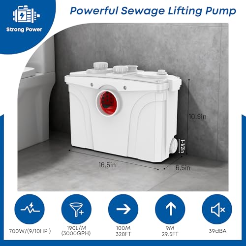 700W Powerful Pump -- Our macerator pump adopts a high efficient 700W motor, featuring a vertical pumping up to29.5-Feet and 328-Feet horizontally. The pump can easily and quickly dispose of your wastewater against gravity. Designed to pump away the waste from toilet, washbasin, bidet, shower, kitchen sink, dishwasher and laundry machine and also perfect for basements or other areas where the toilet is below the main line.