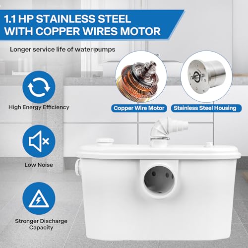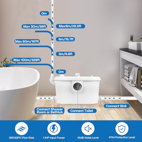 750W Powerful Pump: Our macerator pump adopts a high efficient 700W motor, featuring a vertical pumping up to29.5-Feet and 328-Feet horizontally. The pump can easily and quickly dispose of your wastewater against gravity. Designed to pump away the waste from toilet, washbasin, bidet, shower, kitchen sink, dishwasher and laundry machine and also perfect for basements or other areas where the toilet is below the main line.