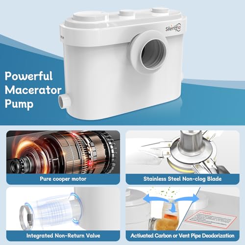 ?Powerful 750W Copper Motor? Equipped with an industrial-grade 750W motor, this powerful macerator pump can effortlessly pulverize solid waste and achieve a smooth vertical pumping lift of up to 36ft, horizontal discharge up to 360ft. It is ideal for basement toilets, sinks, showers, and bathtubs.