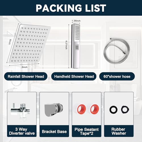 Shower Head Set: You receive an 8-inch square shower head, a shower head handheld, a 60-inch stainless steel hose, a powerful suction cup shower bracket, a three-way diverter, Teflon tape, gaskets