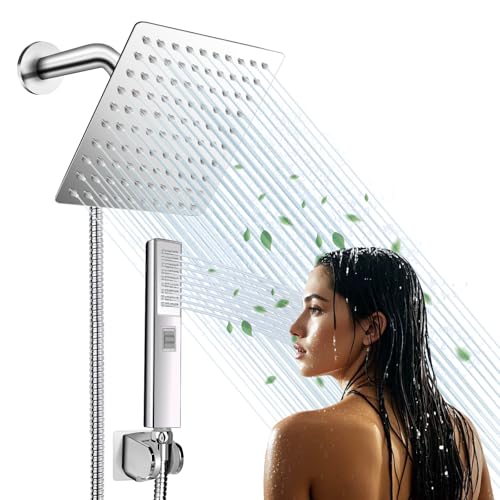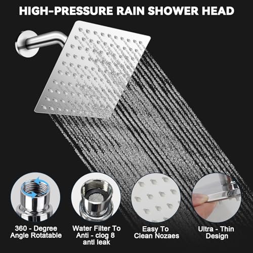 8 Inch Shower Head Rainfall: Made of 304 stainless steel, electroplated treatment to prevent rust, slim one-piece design to avoid side breakage and leakage problems, delayed lifespan. Equipped with 100 anti-clogging silicone nozzles to ensure smooth and even water flow
