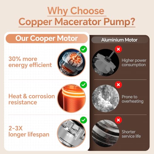 800W UPFLUSH MACERATING SYSTEM -- Engineered with an industrial-grade 800W motor (30% more powerful than standard models), our system pulverizes waste with surgical precision. The advanced vortex flushing technology propels waste vertically up to 36 feet (11 meters) or horizontally across 360 feet (110 meters), effortlessly handling multiple fixtures simultaneously.