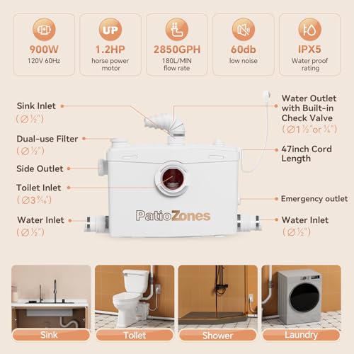 HIGH POWER 900W PUMP -- Our heavy-duty macerator pump system enables flexible bathroom installation, capable of pumping wastewater vertically up to 39.3ft horizontally up to 393ft from the main sewer line. Powered by a robust 900W motor with an integrated grinding mechanism, it efficiently processes solid waste—making it an ideal solution for basement conversions, rental units, or any below-grade installations where traditional plumbing isn't feasible.