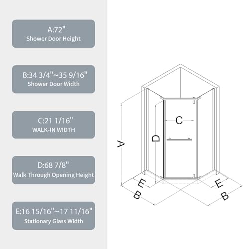 Compact Corner Design: Adjustable 34.75-35.65"W x 72"H shower enclosure maximizes space in small bathrooms, with a 21-inch walk-in opening for convenient access.