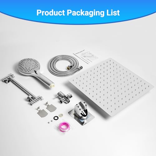 [12" LARGE STYLISH RAIN SHOWERHEAD]:All-Chrome Finish 304 Stainless Steel for highest rust resistance and longevity. Reliable leak-proof connection. Ultra-thin design and advanced air booster technology for higher water pressure, even at low flow and pressure. (NOTE: Reverse hose if handle doesn't fit in holder!)
