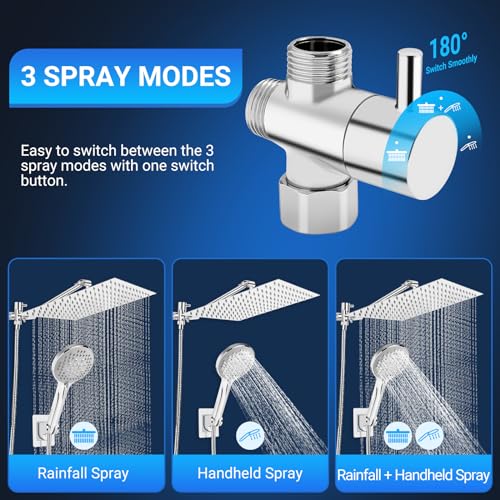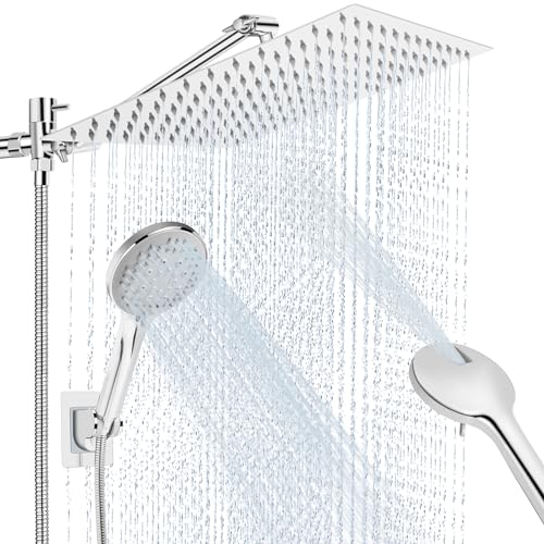 [SHOWER HEADS WITH HANDHELD SPRAY COMBO]: 12" Large Square Rainfall Showerhead, chrome face 5 spray settings handheld shower, 5ft stainless steel hose, 3-way diverter,strong suction cup shower bracket, Teflon tape, washers, installation manual