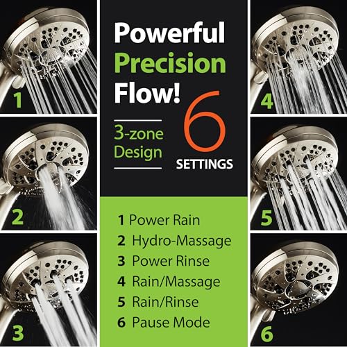 Deluxe 6-Setting 3.5" Face Hand Shower: can be used as Overhead or Handheld shower, High-power Click Lever Dial, Ergonomic Grip Handle, Rub-Clean Jets for easy cleaning and preventing lime buildup, All-Surface Brushed Nickel Finish including face and accessories