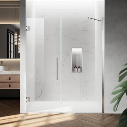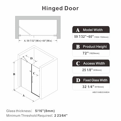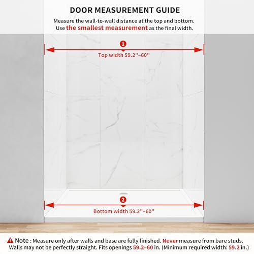 Pivot Shower Door Design: This hinged shower door measures 59.2–60" W x 72" H and features a generous 25.1" walk-in opening for easy entry and exit without feeling confined. The sleek frameless style complements any bathroom style, while the 180° two-way pivot design allows the door to swing both inward and outward for added safety and convenience. Please note that all shower door measurements must be taken only after the tile or finished wall materials have been fully installed. Do not measure from wooden studs or unfinished openings, as these measurements are not accurate for proper fit.