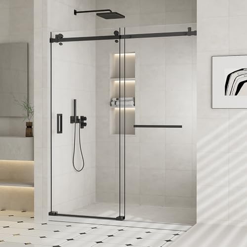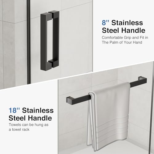 ????[High Quality Stainless Steel Hardware] Sliding shower door is made of sturdy and durable stainless steel frame and modern frameless design, stainless steel top sliding rail and rollers have excellent corrosion and oxidation resistance, which ensures the stability of each slide and prolongs the service life of the shower door. Two stainless steel handles can be towel racks, providing a place to put clothes and towels. Modern frameless design shower door makes your bathroom look brighter and more spacious, so you can enjoy every shower time!