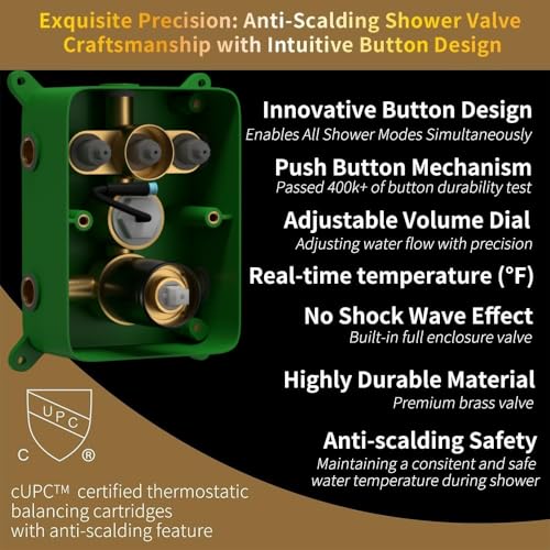 Certified Anti-Scalding Shower Valve and Safe Shower System: AYIVG shower system is made with your family’s safety in mind. Equipped with pressure balanced shower valve, it ensures quality, longevity, and prevents burns due to sudden fluctuations in hot or cold water temperature.
