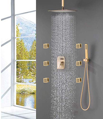 Rain Shower Body Spray Jets System: Including 12 inch Square rain shower head?304 stainless steel?, handheld shower head?Brass?, 12 inches shower arm?Brass?, 59 inch shower hose?304 stainless steel??shower holder?Brass?, shower mixer control valve?Brass?,6 Pcs shower body jets (Brass) .