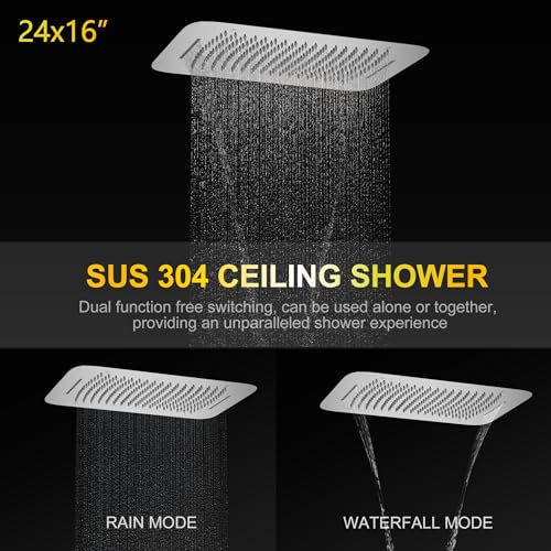 ?4 Function Shower System?Ceiling mount shower system includes rainfall waterfall shower head, 6 shower body jets, a hand shower , each function is controlled by a knob, so all functions can work simultaneously or individually