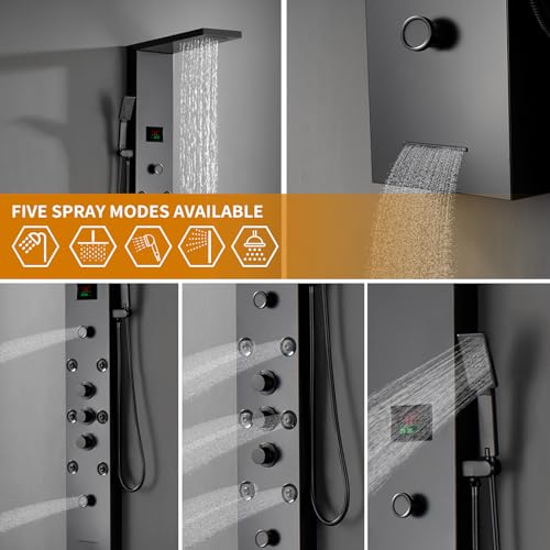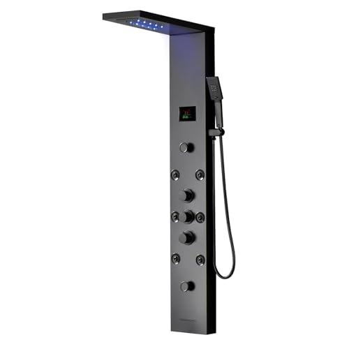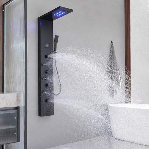 ?LED & Temperature Display?This LED shower panel tower comes with blue LED on the rainfall shower head and it's powered by water flow(no batteries need).The digital temperature display on the shower panel tower system directly and instantly,makes water temperature visible.