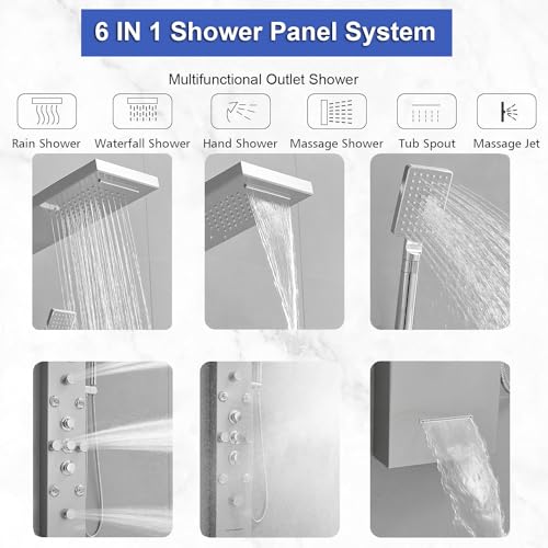 ?6 IN 1 Shower Tower?6-functions:2 massage body jets;4 mist nozzle;waterfall tub filler spout;rainfall shower head;waterfall shower head and 3-setting handheld shower fixtures.You can enjoy SPA at your home.