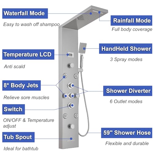 ?304 Stainless Steel Shower Panel?Shower tower construction of rust-proof 304 steel thickened panel,brass mixer valve,shower diverter valve and explosion-proof hoses make this shower column stable and reliable.