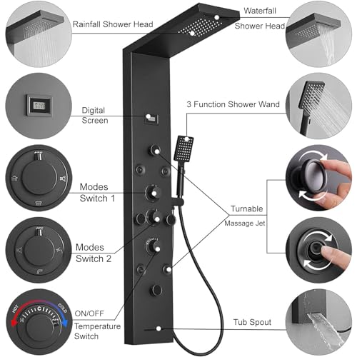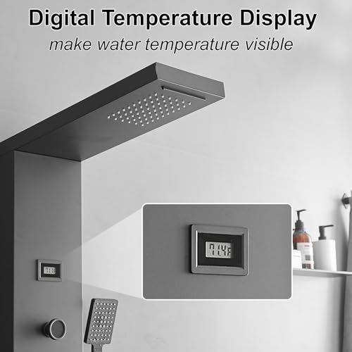 ?Digital Screen?The digital temperature display on the shower panel tower system directly and instantly,makes water temperature visible.It's powered by 2 AA batteries(not include).
