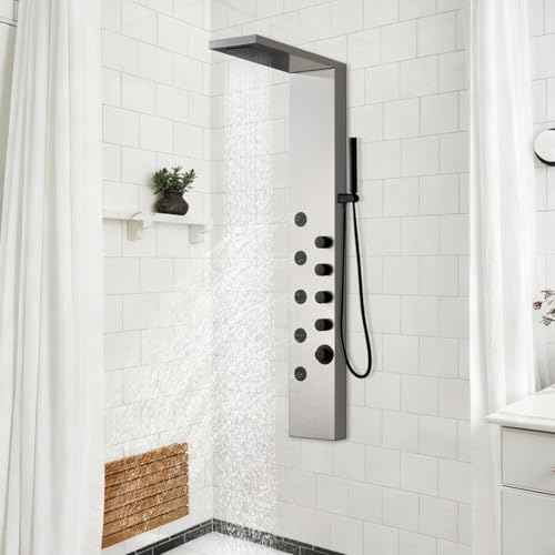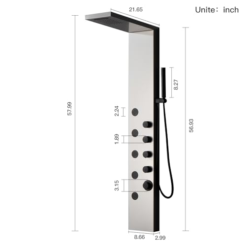 Multi-functional Adjustment: The shower tower system has 5 massage nozzles and a 3-function handheld shower, including four massage jets with adjustable angles, which can provide pulsating power for different shower experiences. The included handheld shower head has a long and flexible hose to easily reach hard-to-reach areas, making every shower a rejuvenating break