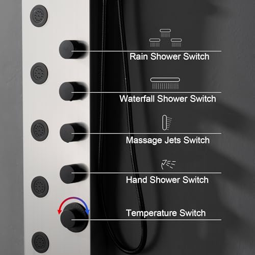 Adjustable Temperature and Water Flow: The shower panel tower system is equipped with an adjustable temperature switch, allowing you to customize the temperature to your preference. The adjustable flow of the handheld shower head can customize the water flow according to your needs, ensuring you get a perfect shower experience every time