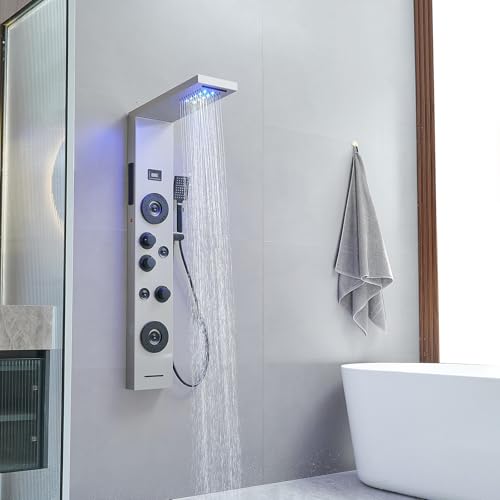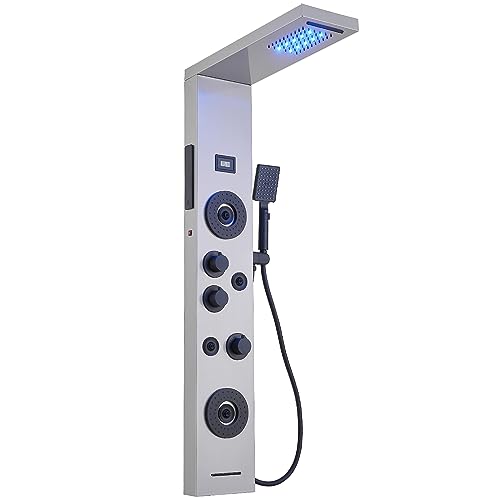Flexible Temperature Control: Our shower tower is equipped with LED lights and temperature displays that allow you to easily control showering experience. You can adjust the water flow and temperature to your liking for a personalized, comfortable shower every time (batteries sold separately).
