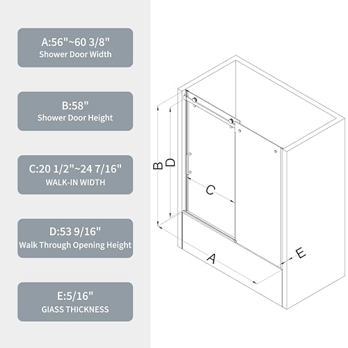 Bathtub Shower Door, 56" - 60" W x 58" H Semi-Frameless Glass Shower Door with 5/16" Clear SGCC Tempered Glass, Easy to Clean & Easy to Install, Chrome