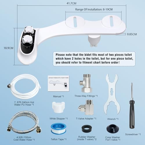 ?Easy to Install & Save Money?This non-electric bidet comes with high-quality accessories and is compatible with most toilets. It can be installed easily on standard two-piece toilets without removing the seat, thanks to the clear, step-by-step instructions provided. Using a bidet can greatly reduce your toilet paper consumption, saving you money while providing a more thorough and eco-friendly cleaning alternative.