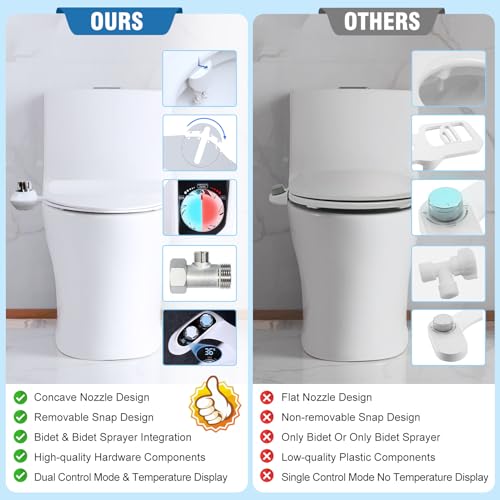 ?Why Choose Us???Our bidet features a unique visual temperature display, making it easy to adjust both temperature and pressure. With dual hot and cold settings and dual nozzles, it ensures a comfortable wash. ?The concave nozzle design prevents the toilet lid from lifting, offering maximum comfort. ?The innovative snap-fit design allows for quick installation without removing the toilet seat.