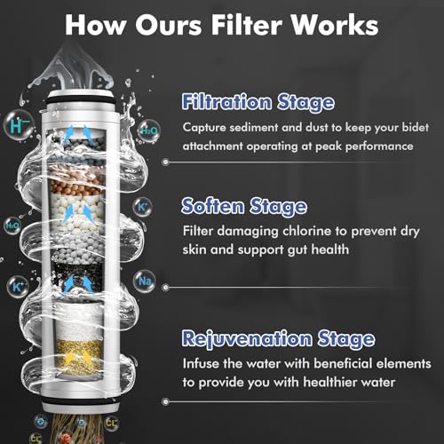 [Innovative Bidet Attachment with Filter]The innovative bidet attachment with filters stands out from ordinary bidet attachment. The newest designed filtered bidet is equipped with powerful filter layer including superior KDF, calcium sulfite and so on , helps to remove chlorine, heavy metals(lead, mercury, nickel, chromium) and other harmful substance, it protects your bidet water safety and keep your bidet attachment operating at peak performance, keep gut health. If you need to replace the bidet filter, please purchase the filter element link in our store: B0D838P4XH.