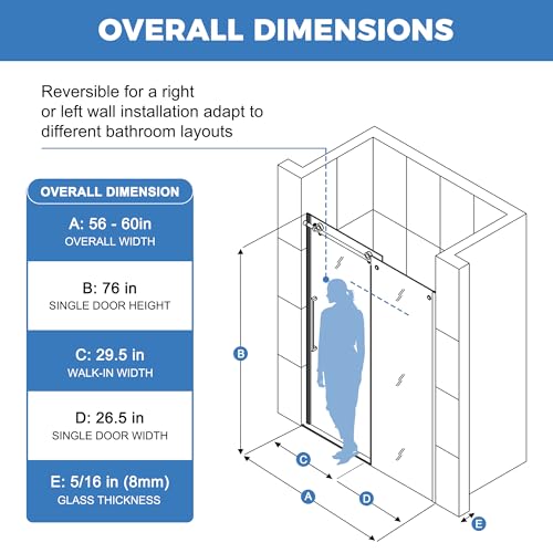 ADJUSTABLE WIDTH: The frameless shower door can be adjusted between 56 and 60 in width by cutting, providing the perfect fit for your bathroom space. The stainless steel top guide bar on this width-adjustable frameless shower door can be trimmed up to 4 in. for width adjustment.