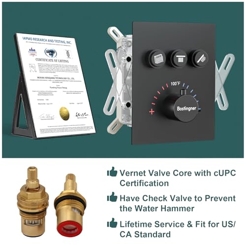 Thermostatic Shower Faucet Set: Smooth lines and classic shaping make up the Bostingner Rain Shower System, complements a modern or traditional design and boasts luxurious, spa like features, Pampers you with thermostatic technology that keeps water at a comfortable temperature each time you shower regardless of changes in water pressure, The best choice for your family