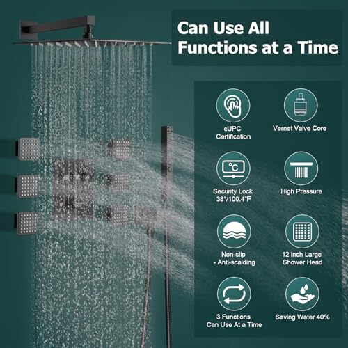 Personalized Water Control: The intuitive operating concept with a button, this stunning shower head system lets you choose between a handheld shower, massage body spray jets and a rainfall showerhead with just one click or enjoy all of it AT THE SAME TIME, The safety lock can fix the water temperature at 38 degree 100°F to prevent scald