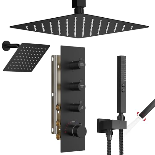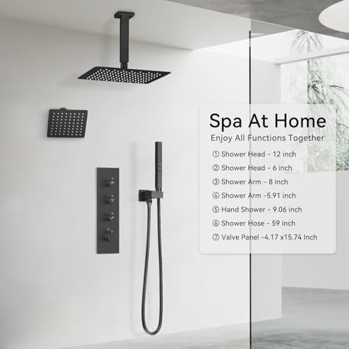 ONE UNIT WITH FOUR FUNCTIONS:The shower faucet set has 12 inch ceiling mounted head and 6 inch wall mounted high-pressure shower head,the handheld spray two-function design,the spray gun mode features a high-pressure hose, which is widely used to clean pets,wash the floor, bathtub, toilet, etc.This new feature allows for a whole new shower experience.