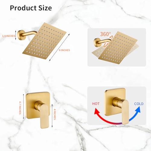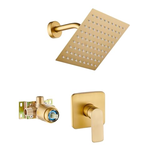 Brushed Gold Shower Faucet Single Function Trim Kit with Rough-in Valve Set Bath Rainfall Shower System 8inch Square Stainless Steel Metal Shower Head