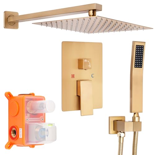 Brushed Gold Square Shower Head with Handheld Set, Rainfall Shower System Modern Wall Mounted Shower Faucet for Bathroom 10 inch (With Shower Valve)