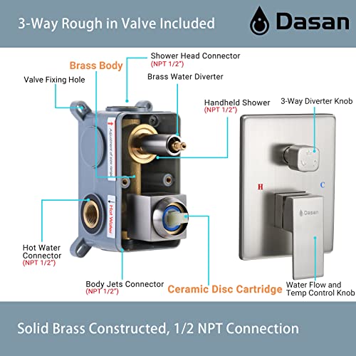 ?Multi Shower Head System: The shower system includes a 12’’ ceiling mount rainfall shower head, solid brass handheld sprayer and 4 pcs body spray jets. All shower heads are designed to be angle-adjustable to fully massage your body, which provides a super relaxing shower experience.
