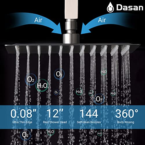 ?12'' Large Shower Head: Dasan ceiling mount 12’’ rainfall shower head shares the same flow rate at 2.5 GPM like most 10’’ shower heads did but comes with 144 jetting nozzles for a higher pressure shower experience and larger body coverage.