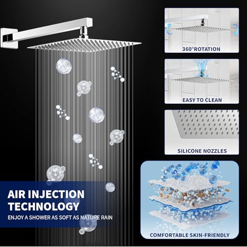 Air Pressure Technology: Inject the air into rain Shower head to mix water with air, and the water pressure up to 2.5GPM instantly, simulates the natural raining to provide you with natural contact of water experience,giving you a pleasant Shower,easy to clean and maintain