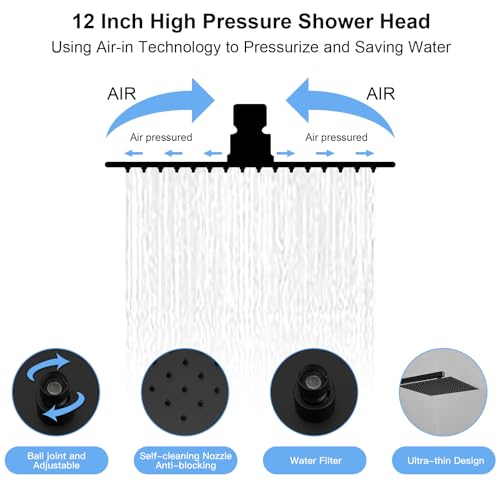 Rainfall shower head: The rainfall shower head is made of high-quality 304 stainless steel, which is durable and rustproof. The 12-inch size provides a wide and comfortable showering area, and the high-pressure design ensures a strong and steady water flow.