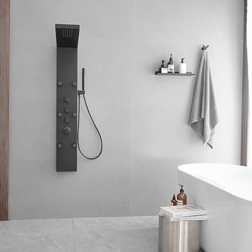 BWE Matte Black Shower Panel Rainfall Waterfall with Handheld Shower Stainless Steel Shower Tower Panel System Massage Body Jets with Tub Spout Water Temperature Display Wall Mount