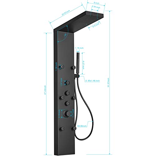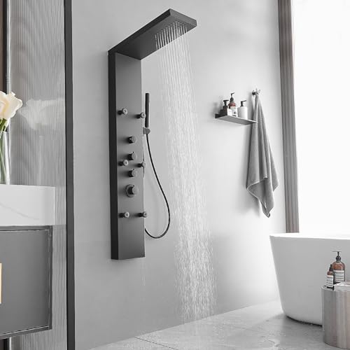 ?6 IN 1 Shower Panel?This shower tower features rainfall, waterfall shower head, 4 body jets, 4 mist sprays, 3 setting handheld shower wand and waterfall tub spout, a completer shower column system