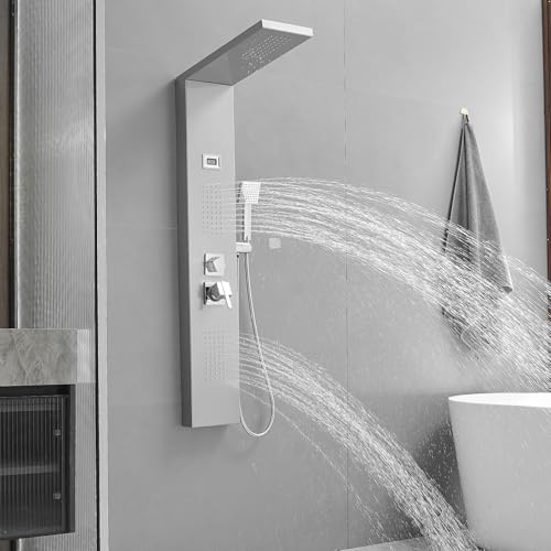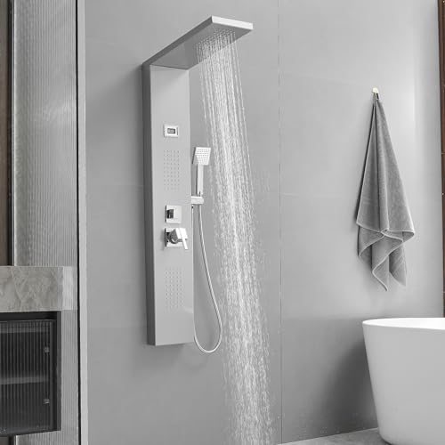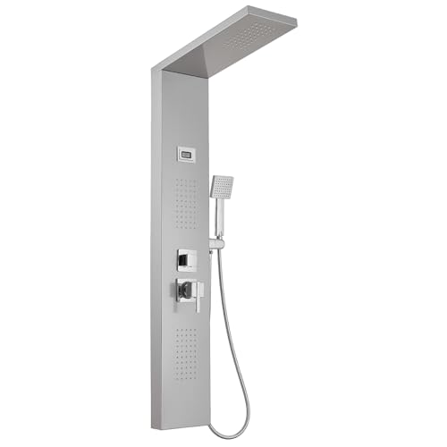 BWE Multi-Function Shower Panel System with Rainfall Shower Head Massage Body Jets and Handheld Shower Head 3 In1 Shower Panel Tower Stainless Steel for Home Hotel Resort Brushed Nickel and Chrome